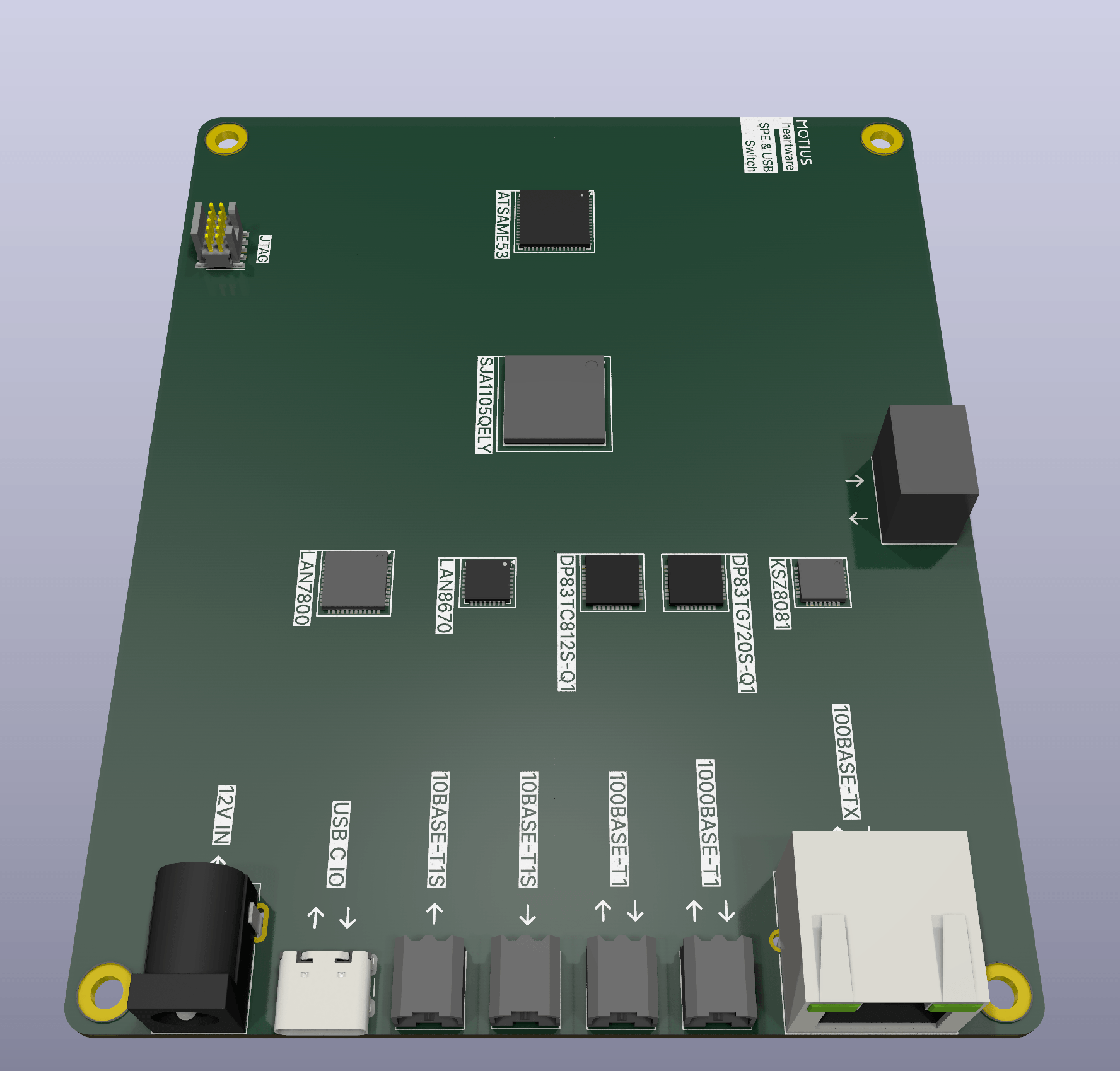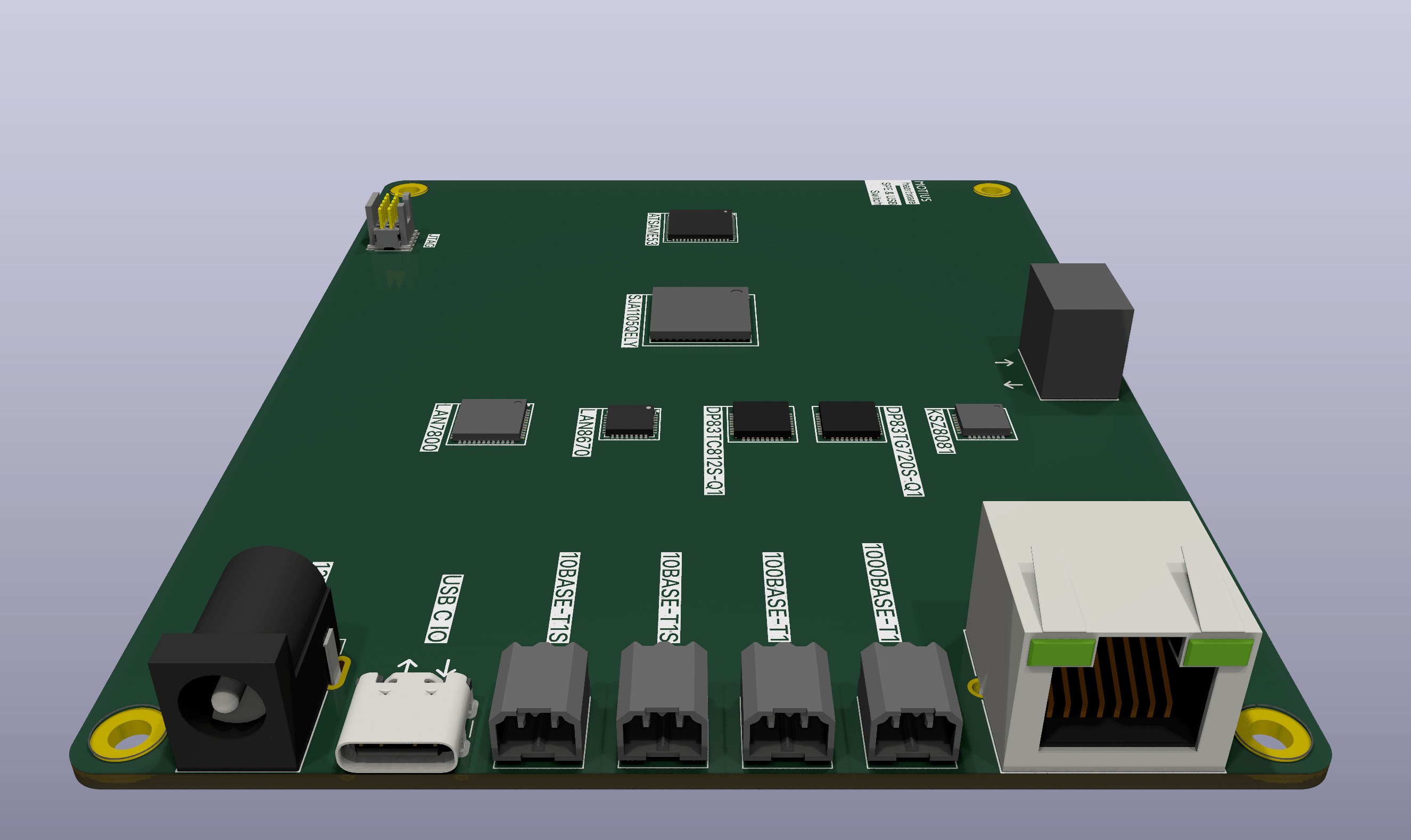 The Single Pair Ethernet (SPE) switch is designed to accommodate various ethernet standards. The PCB includes a microcontroller, a ethernet switch and various PHYs that support the different standards. Furthermore, the PCB is built up in a modular way, so that the PHYs can be swapped.