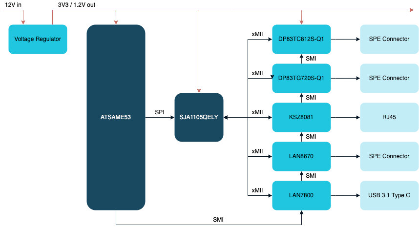 Each of the Ethernet standards has their own PHY, performing the required physical layer functions for the respective Ethernet standards. The SJA1105QELY switch IC integrates all the MAC functionality for the individual PHYs. All of this is controlled by the SMI (Serial Management Interface) signals (MDIO (Management Data Input/Output) and MDC (Management Data Clock)) from the ATSAME53 microcontroller.