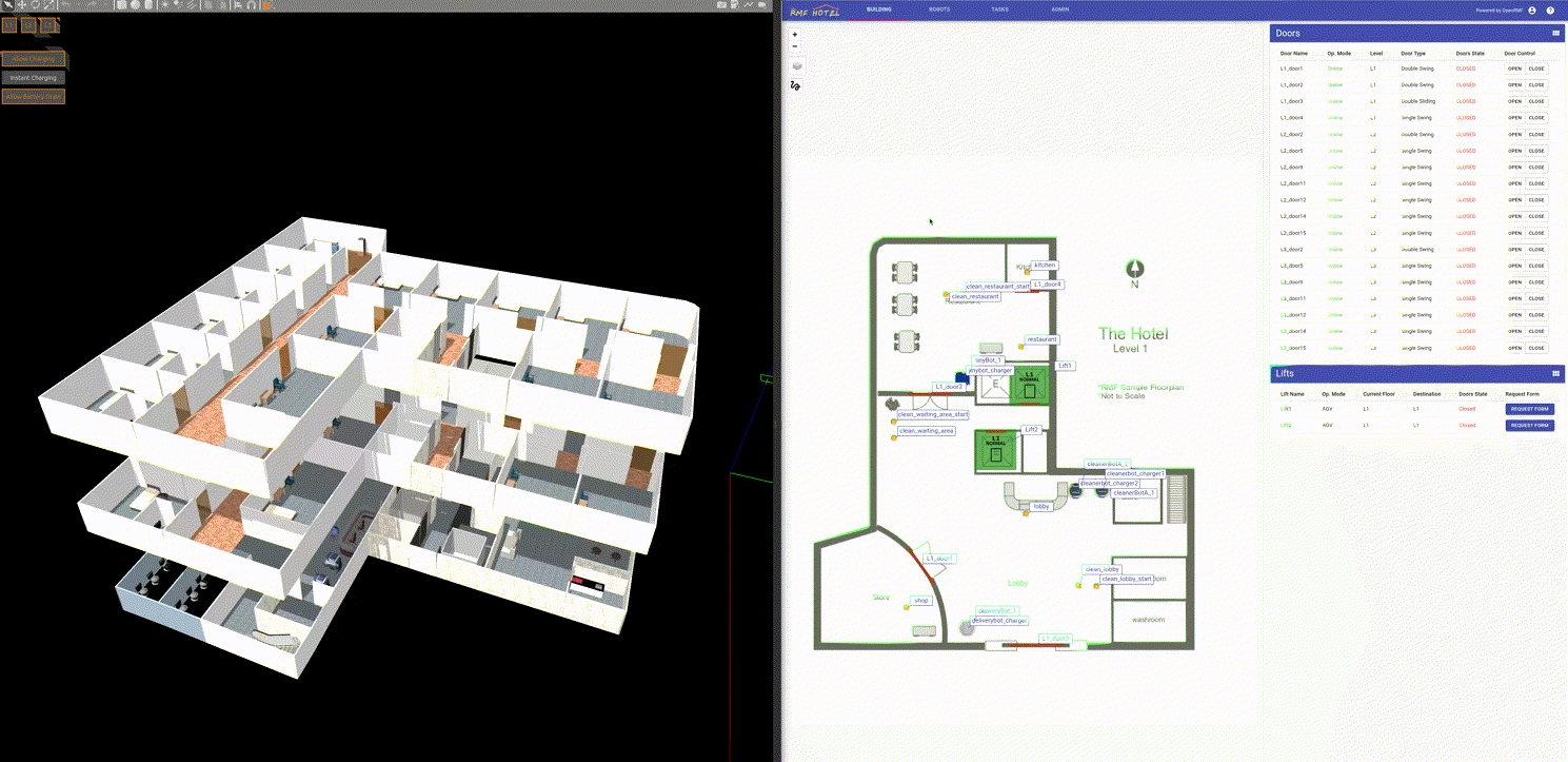 OpenRMF integrates with the simulation environment to send commands, create robots dynamically, and provide real-time feedback on robot poses.